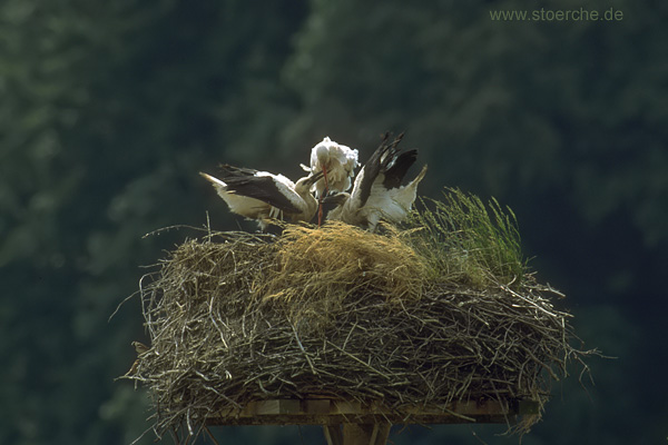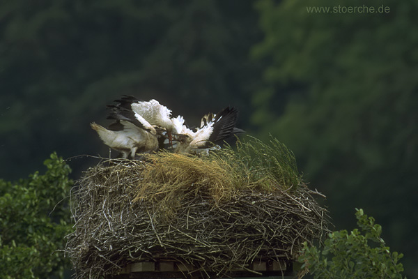 Jungstörche wurden gefüttert. Kurz darauf flog auch das Weibchen wieder zur Nahrungssuche los, und es kehrte wieder Ruhe ein.