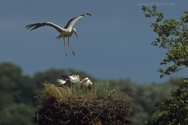 männliche Altstorch begann mit heftigem Abwehrklappern, denn es kreiste ein fremder Storch über dem Horst. Schon nach kurzem