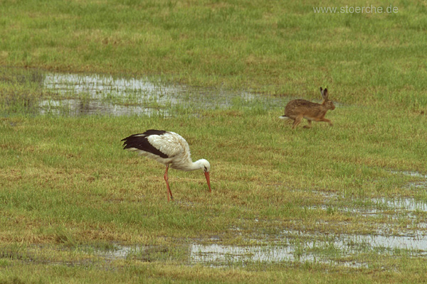 Situation, denn ein Feldhase (Lepus europaeus) lief nah am Altvogel vorbei. Weder Storch noch Hase waren voneinander beeindruckt. Auch