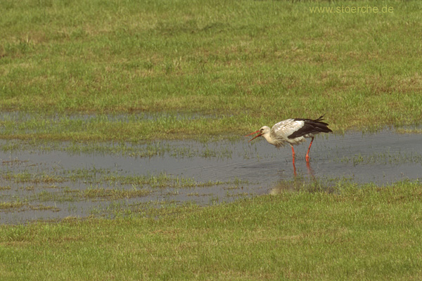 Jungstorch wieder auf den Feldern, die in Sichtweite zum Horst liegen unterwegs und hat erfolgreich Beute gefangen. Dabei