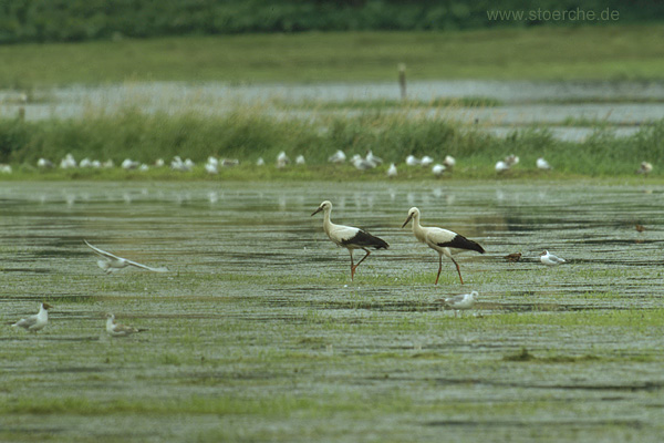 von dem kleinen Schwarm Stare (Sturnus Vulgaris) blieben die Altstörche unbeeindruckt und ließen sich nicht stören.